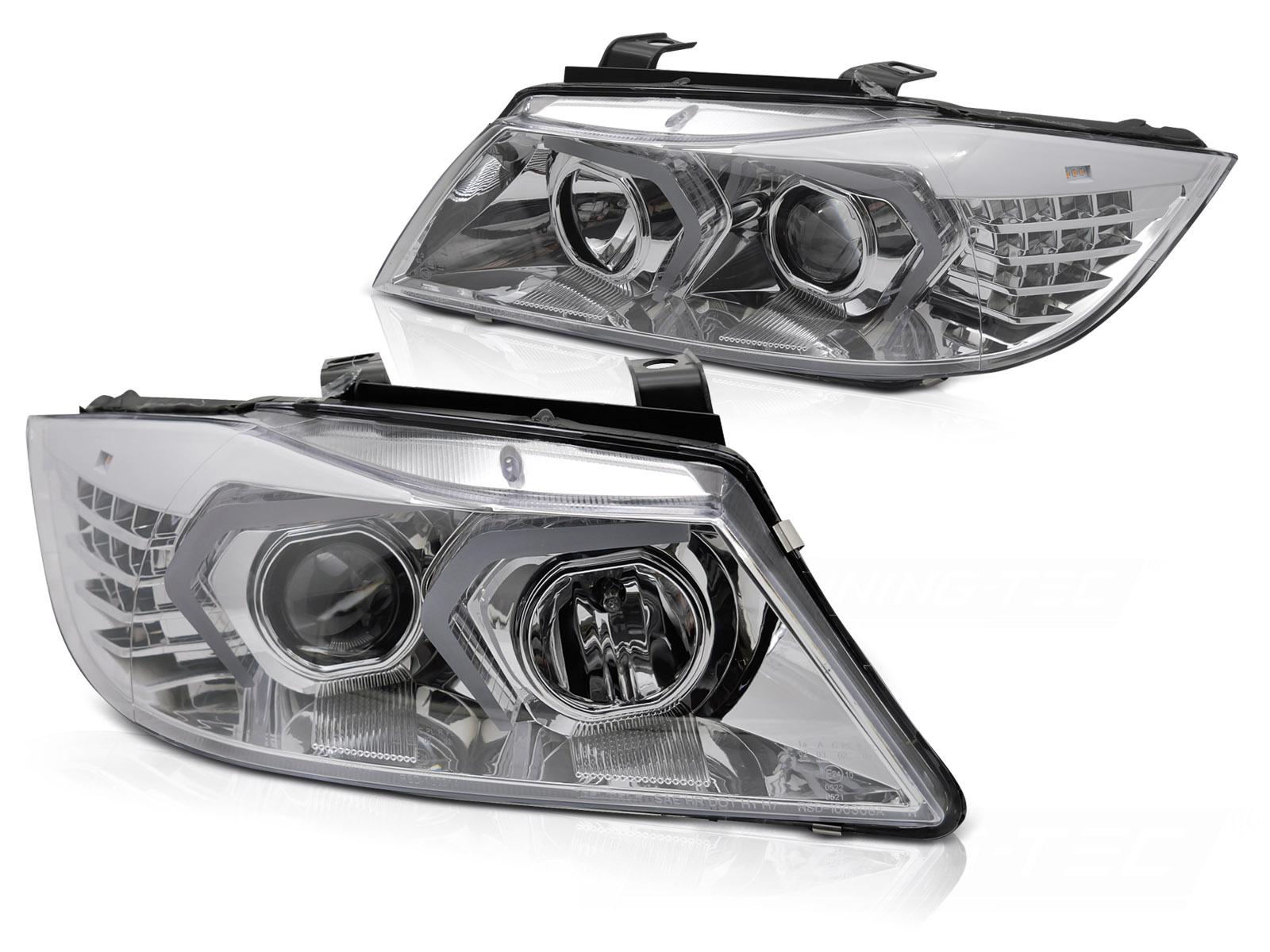 - Конструкция и геометрия комплекта передних фар полностью соответствует модели BMW E90, что гарантирует полную совместимость крепления и подключения.