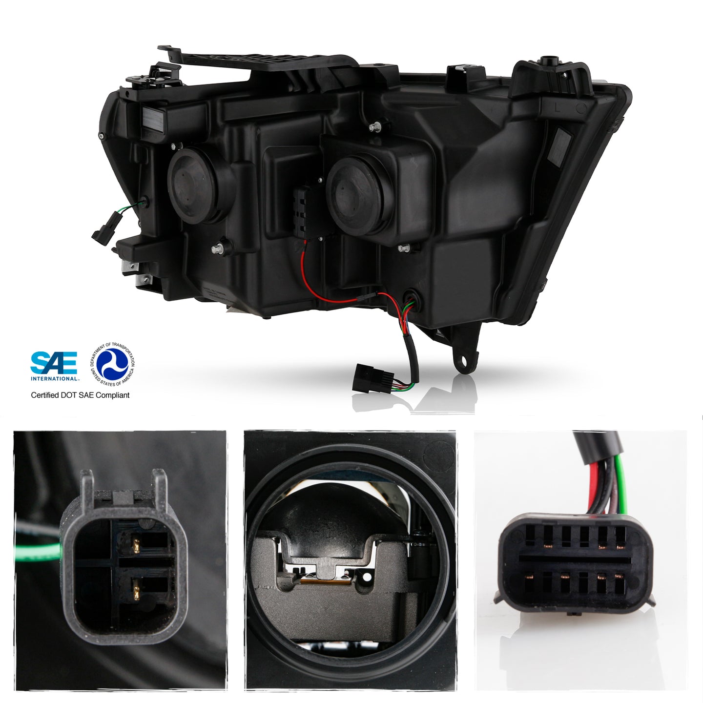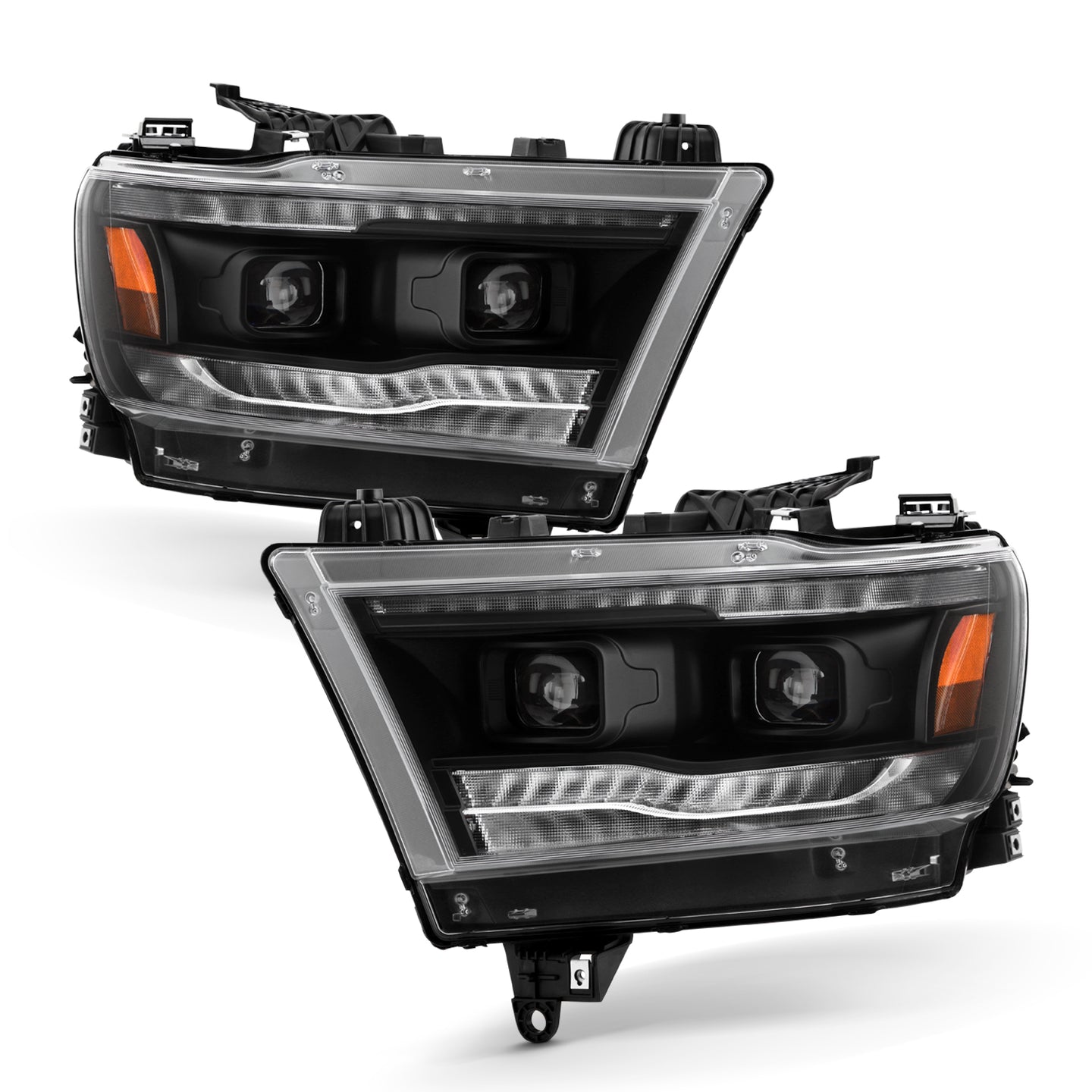 - Конструкция и геометрия комплекта передних фар полностью соответствует модели Dodge Ram, что гарантирует полную совместимость крепления и подключения.