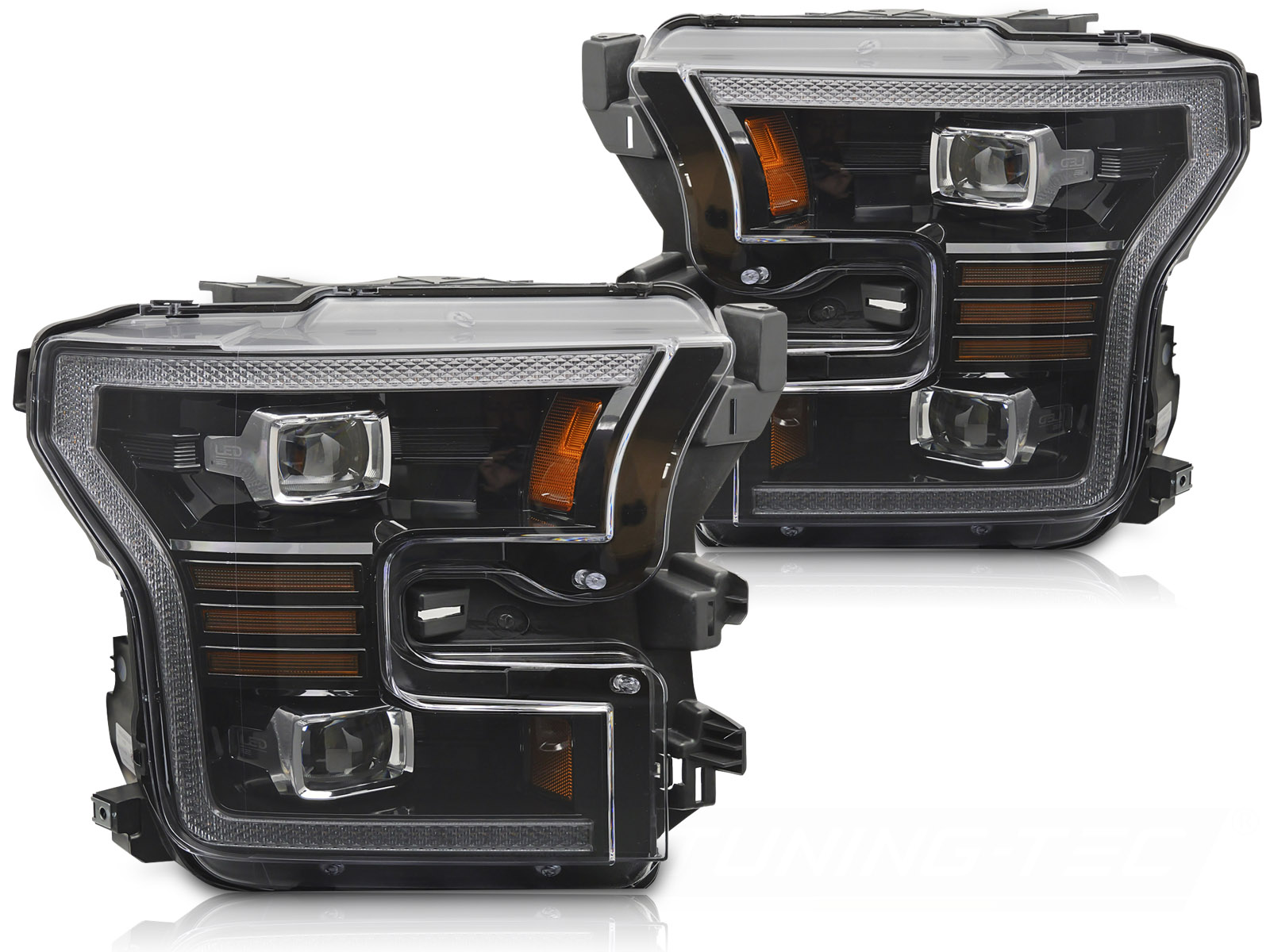 - Конструкция и геометрия комплекта передних фар полностью соответствует модели Ford F150, что гарантирует полную совместимость крепления и подключения.