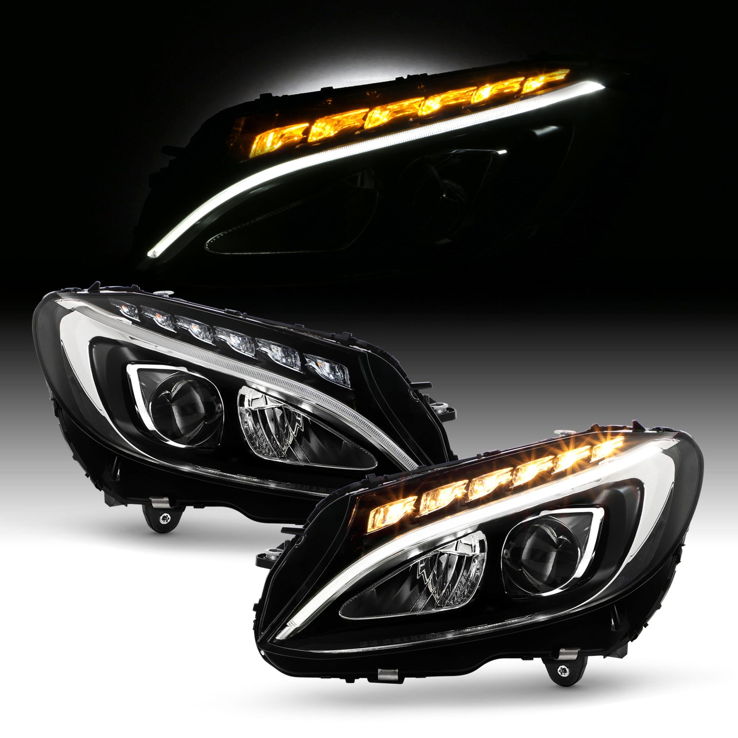 - Конструкция и геометрия комплекта редних фар полностью соответствует модели Mercedes C-class W205, что гарантирует полную совместимость крепления и подключения.