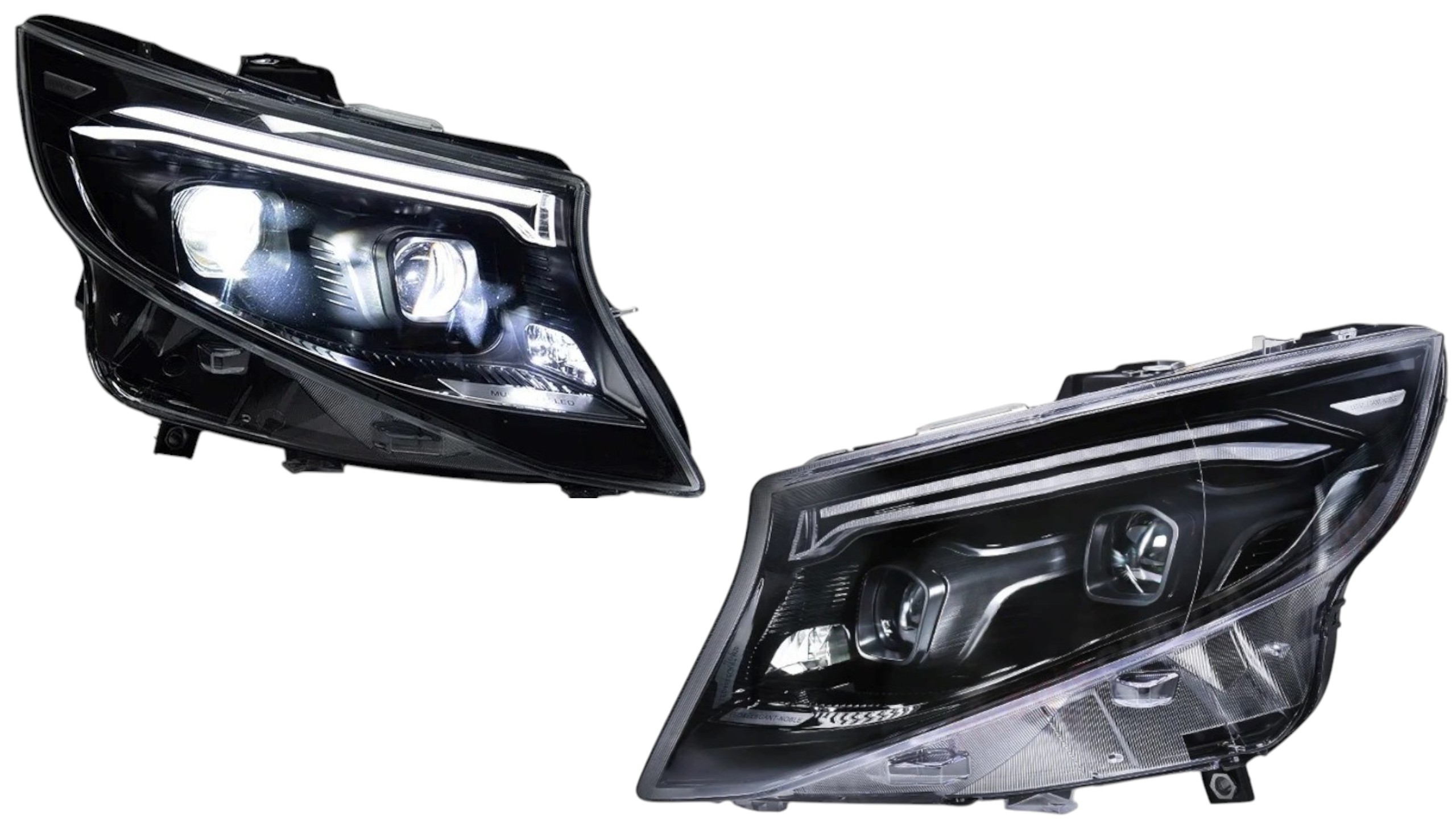 • Конструкция и геометрия комплекта передних фар полностью соответствует модели Mercedes Vito W447, что гарантирует полную совместимость крепления и подключения.