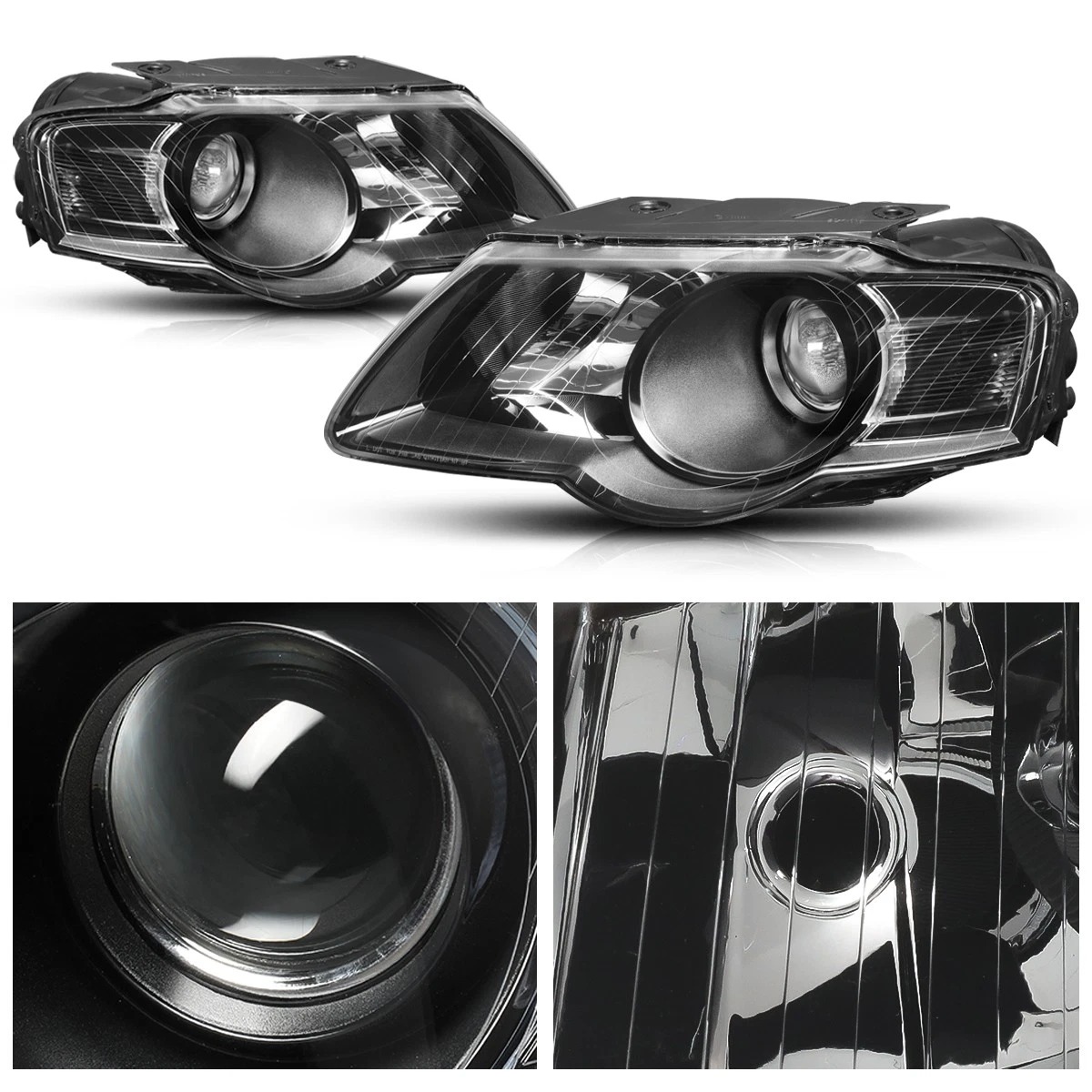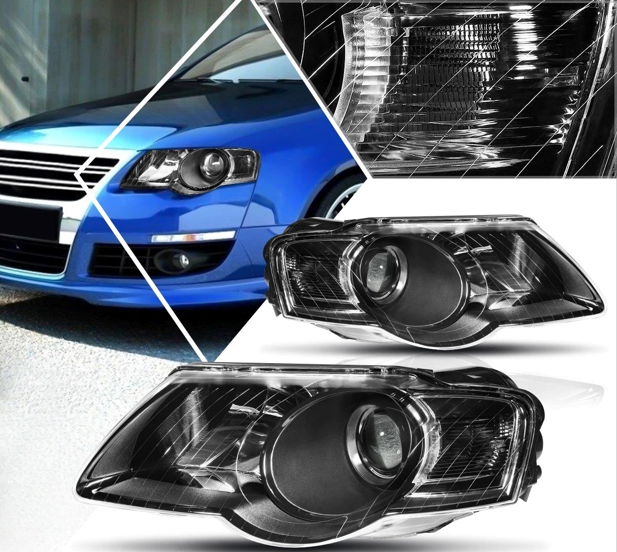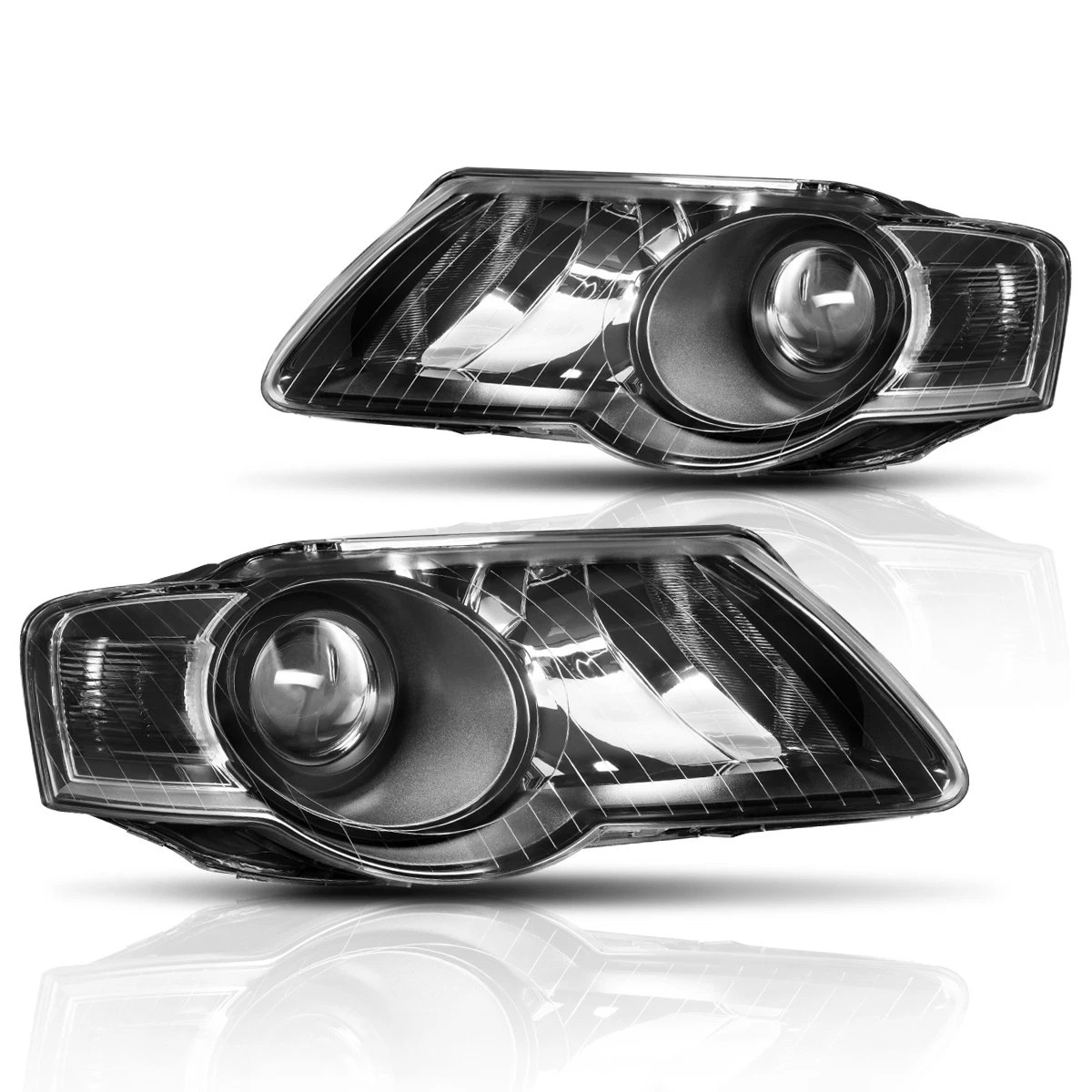 • Конструкция и геометрия комплекта передних фар полностью соответствует модели Volkswagen Passat B6, что гарантирует полную совместимость крепления и подключения.