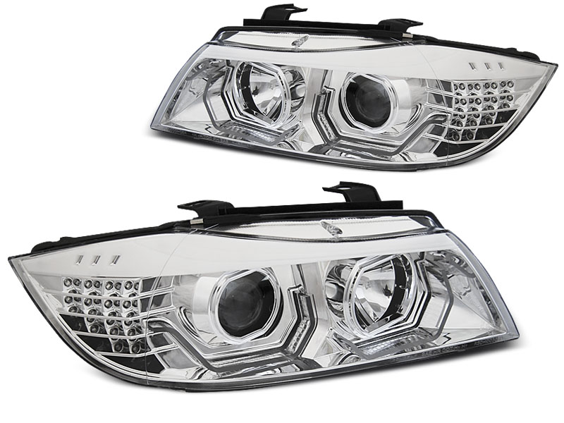 - Конструкция и геометрия комплекта передних фар полностью соответствует модели BMW E90, что гарантирует полную совместимость крепления и подключения.