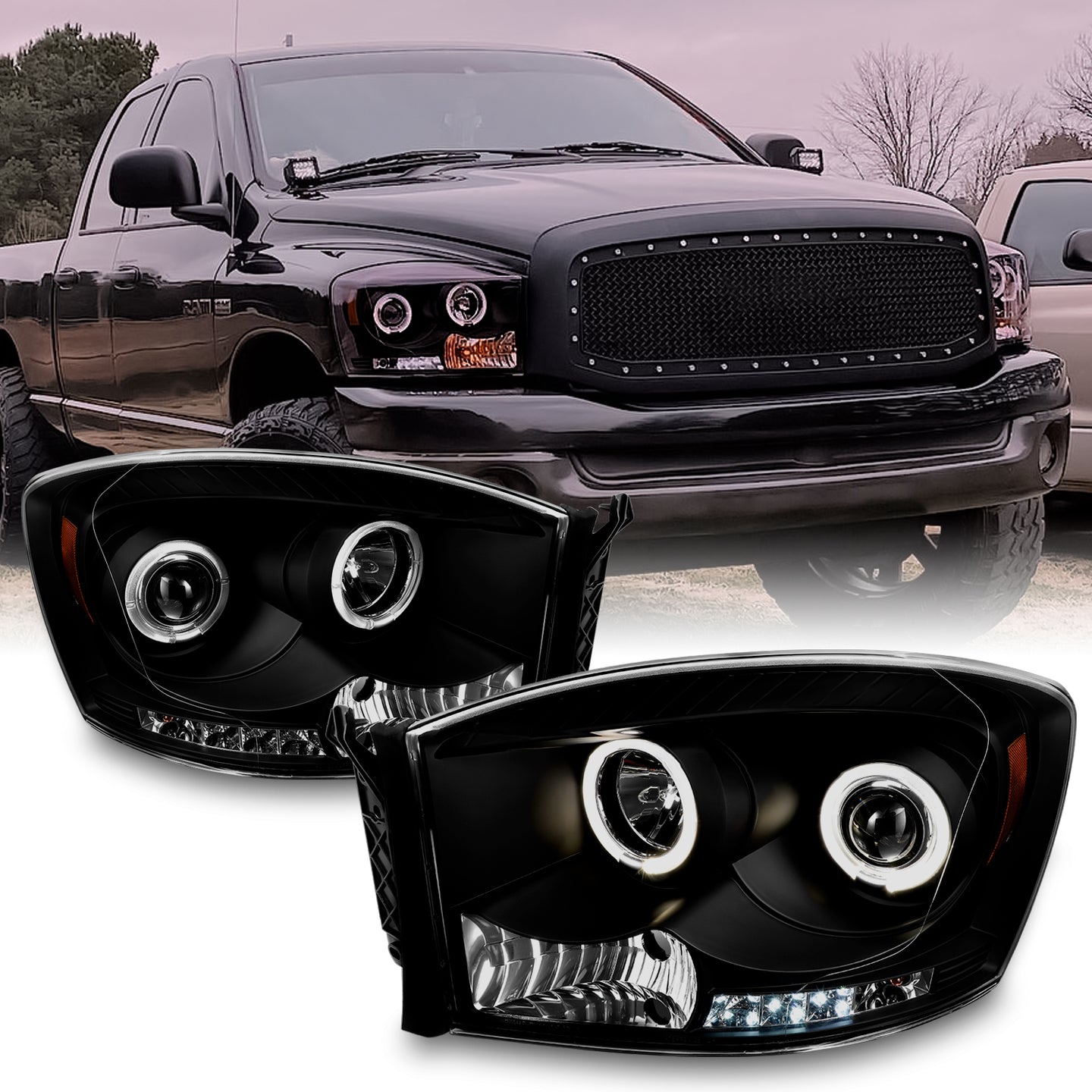 • Конструкция и геометрия комплекта редних фар полностью соответствует модели Dodge RAM, что гарантирует полную совместимость крепления и подключения.