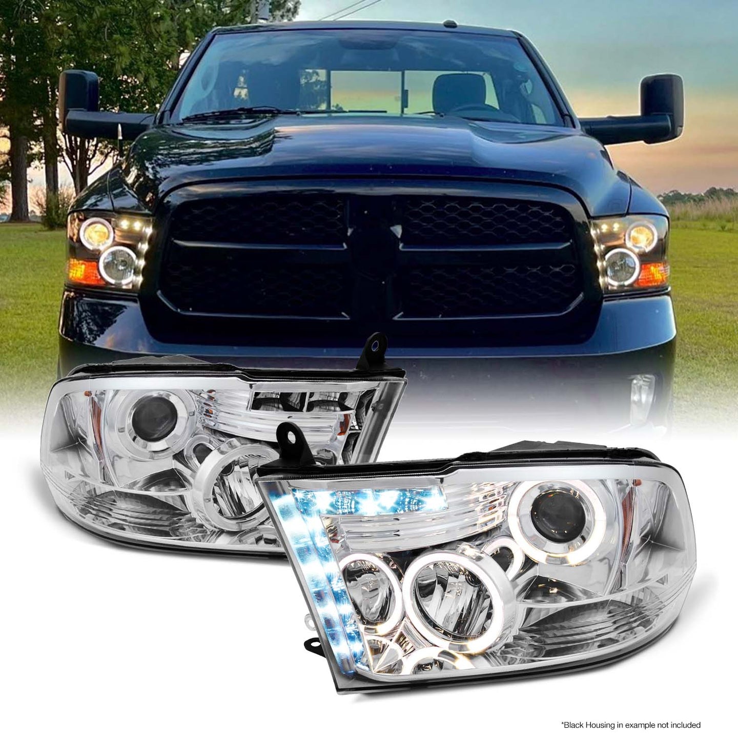 • Конструкция и геометрия комплекта редних фар полностью соответствует модели Dodge RAM, что гарантирует полную совместимость крепления и подключения.