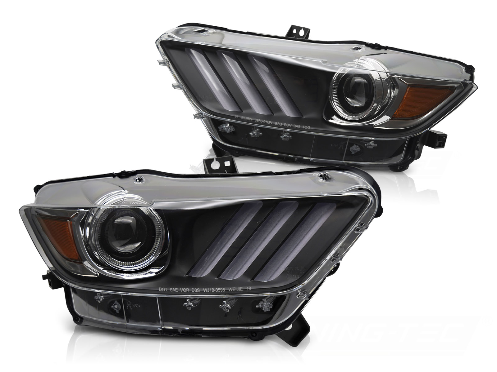 • Конструкция и геометрия комплекта передних фар полностью соответствует модели Ford Mustang, что гарантирует полную совместимость крепления и подключения.